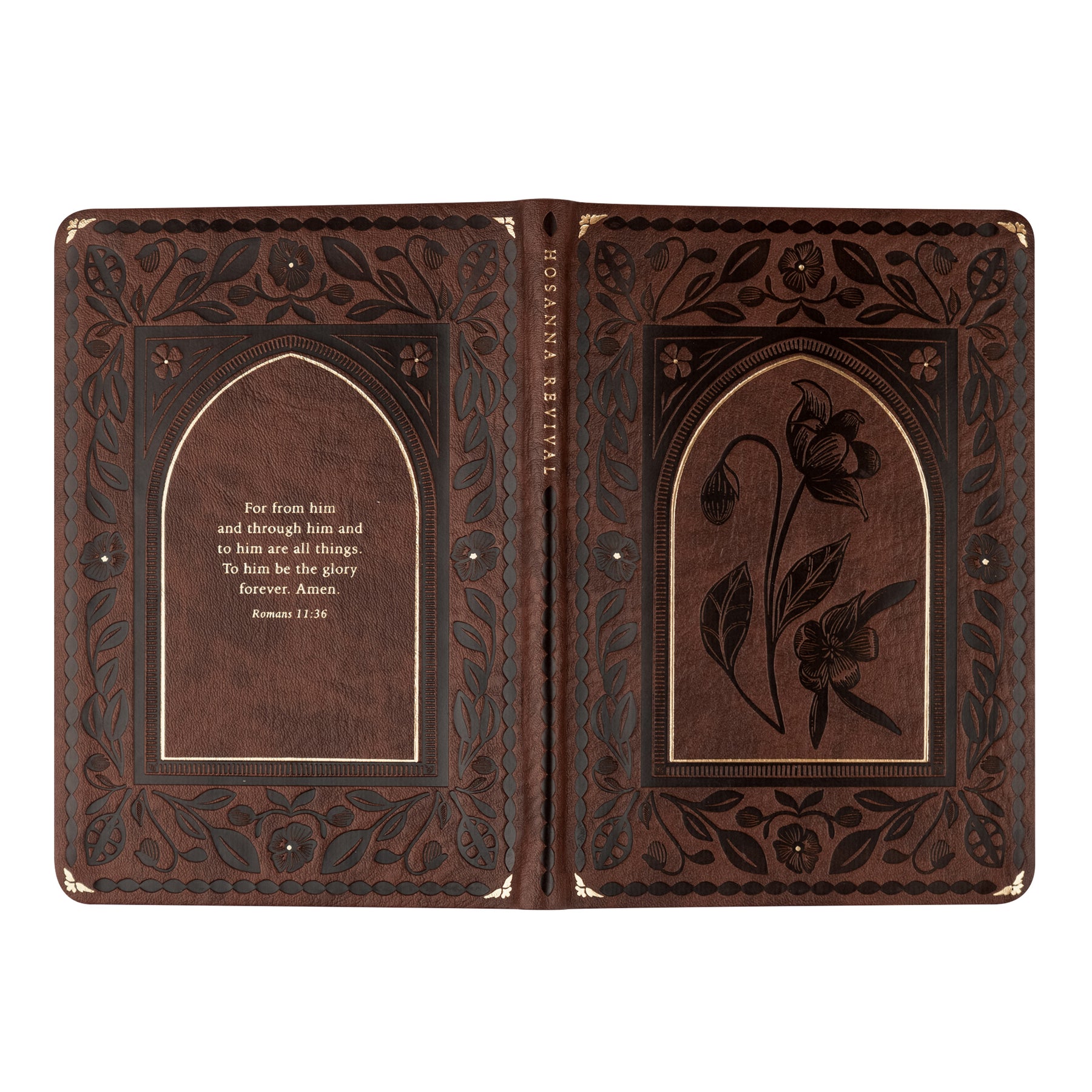 The deep brown color and delicate gold foiling outlining the embossed florals of this Notebook were inspired by the beauty of the Cathedral of Palma in Mallorca, Spain. Its intricate architecture inspired the detailed florals and arched design. Our heart behind this design is that it would remind you of the rich depth that the Word of God carries. The back cover features the verse from Romans 11:36: “For from him and through him and to him are all things. To him be the glory forever. Amen.” This verse calls us to reflect on God’s power over every detail of our lives. All the glory for every good thing is his.